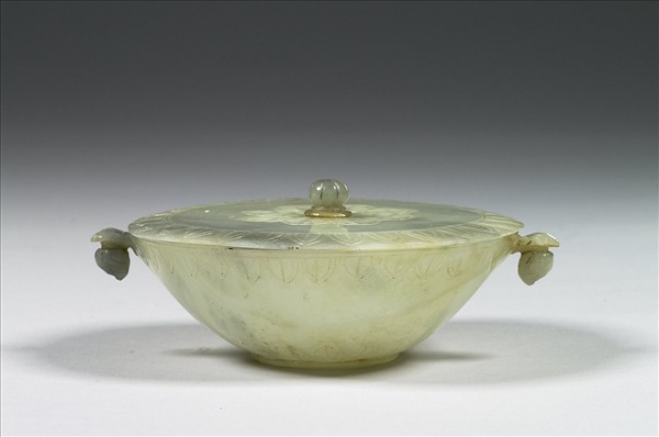 玉質,多條已沁為淺褐色裂痕。琢作一撇口圓碗,圈足。口沿及腹壁下各琢一周簡化葉紋,口沿二側各雕一葉,葉下垂掛一花蕾。平蓋,蓋邊琢一周簡化葉紋,蓋心雕平展的蓮花,蓋鈕作花蕾狀。