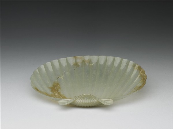 玉質,帶大片褐班。雕做蚌殼形,琢磨得非常細薄。