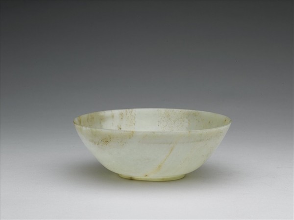 玉質,帶淺褐斑。琢一中型薄壁圓碗,底不正圓,還磨出淺圓槽。腹壁上對稱地刻兩片葉紋,一片只刻於外壁,一片刻在同一部位的內外壁。