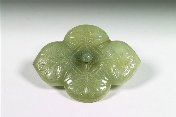 勻淨的淺豆綠色玉,琢作四瓣花式盒,外觀略呈菱形,盒內分為四格。平底,蓋鈕琢作花蕾形,蓋面浮雕四株百合花束。器身周圍雕葉紋一周。