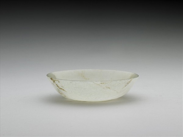 玉質,局部帶淺褐斑。琢一淺腹圓碗,器底為不規整的圓片,底心再磨凹。