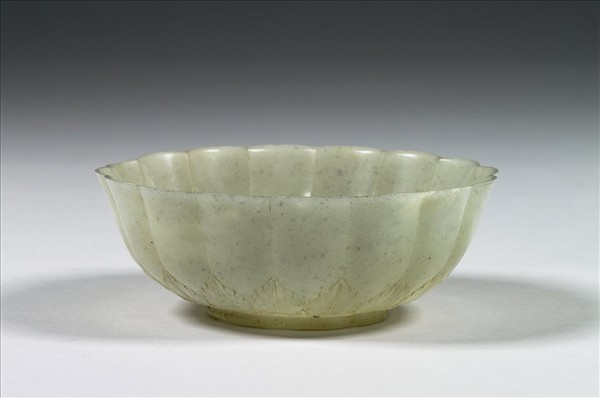 玉質。琢作盛開的十六瓣花。底部又雕琢盛開的八瓣花,圍繞一圈莨苕葉紋。