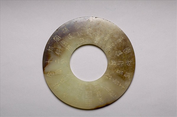 玉質,略黃,局部有深淺不一的褐絲斑,半透明。圓整,中孔、外緣齊整。一面光素,一面刻有乾隆皇帝的題詩,填以金粉,外緣刻字。