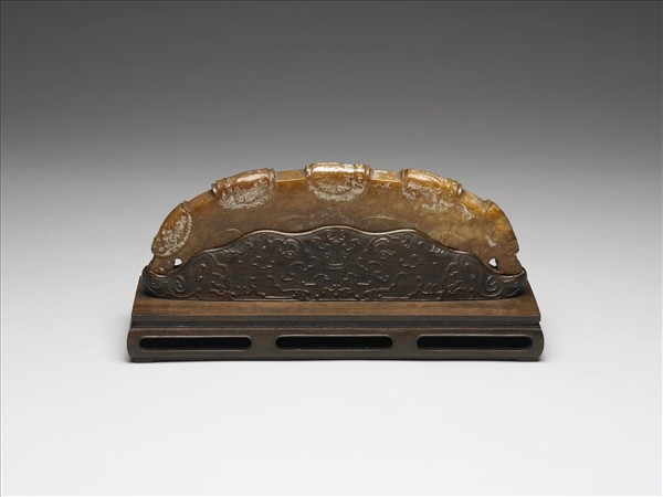 這件清宮舊藏的大玉璜十分特殊。良渚文化遺址出土玉璜體積多偏小,在外緣上等距離浮雕獸龍紋。而這件玉璜不但體積厚大,外緣浮雕了五組大眼面紋,內緣浮雕四組大眼面紋。上緣的五組紋飾未經後代修改,因年久磨蝕而非常輕淺,無法墨拓;下緣浮雕四組面紋,可能曾有後代玉工根據原來紋飾予以加深,所以可製作拓片。 迄今考古出土良渚文化玉器中尚未見玉璜邊緣浮雕大眼面紋的實例,但從紋飾細部分析,此非明清時期可能製作的仿贗品。故暫將之訂為「良渚系」。有待日後更多出土資料再深入探索。細審實物可知,除了下緣的四個面紋細部被加深外,上緣、下緣的每個面紋之間的圓弧形邊緣都被切成「v」形的轉折,而全器的左右二端改刻出龍的鼻、口、牙。 乾隆皇帝為之配製紫檀木座,並於丁卯年(乾隆12年,1747)為之賦詩,詩加刻於木座底:「密山丹水澄方流,玉膏凝結鼂采浮,天矯變化神螭修,昆吾巧匠窮雕鎪,鬐風鬣雨鱗雲稠,千年土花黝而幽,佩服是宜鏘舜球,五夜文鰩凌空游,用顯嘉瑞歲有秋。」 細讀詩句發現,此詩看似七言律詩,但多了一句,全詩共63字。不知是否乾隆皇帝一時疏忽所致,這也許就是此詩未收入《清高宗御製詩文全集》的原因。