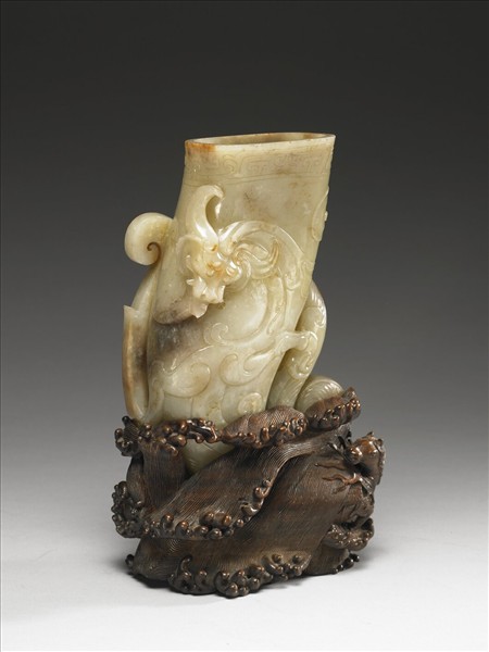 玉質,局部受沁呈褐色。角杯造形特殊,有可能是受到歐亞草原文化器皿的影響。正面龍首為浮雕形式,身尾向下蜿蜒,繞過角杯尖底轉向背面,扭絲紋的龍尾最終延伸至正面右側,並為清晰的龍爪所倚踏。背面另外設計一平面形式的鳳鳥,鳳鳥羽冠因應有限面積,巧妙向上穿越龍尾直指而上,幻化成此時常見的花卉紋樣。本件作品創意十足,實為本時期的代表作。