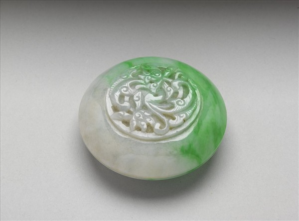 玉質,白色與翠綠色相間。扁圓形盒,圈足。蓋頂雕刻番蓮紋,紋飾布局緊密。配有一高木座,以此盒的尺寸推測,可能當作印泥盒使用。