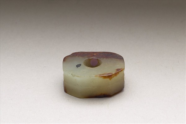 玉質,色灰白,有赭斑。器作八角形柱狀體,外壁隱然有凹痕一圈,將柱體分為上下兩部分。柱面有圓孔貫穿,全器光素無紋。