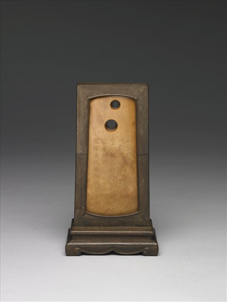 這件玉鉞(斧)整個被染劑遮蓋,不詳其原本玉質與色澤。從造形觀之,介於大汶口文化至山東龍山文化間:因為大汶口文化較多弧刃的玉石鉞,但山東龍山文化較多雙孔的玉石鉞。好古的乾隆皇帝在退休後擔任太上皇的第一年(嘉慶元年,1796),即為之連賦二首詩:〈詠古玉斧珮〉、〈再詠舊玉斧珮〉,(收入《清高宗御製詩文全集‧御製詩餘集》卷16、卷8)詩句刻於器之二面。從詩題可知,乾隆皇帝認為它是可穿繩繫佩的「珮」。