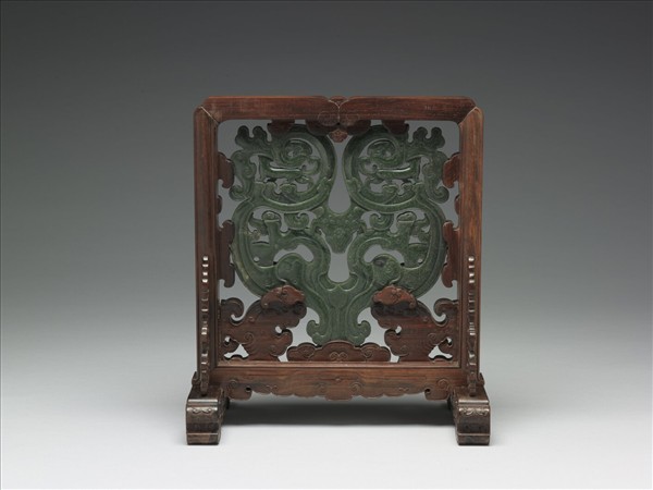 碧玉質。紋樣以山巒為基底,雲氣自山頭向外散逸,珍禽異獸穿梭其間。附木座。座的正面刻「乾隆年製」;座的背面刻乾隆皇帝壬午年(二十七年,1762)御製詩一首,詩錄於《清高宗御製詩文全集》御製詩三集冊五卷十七頁十。