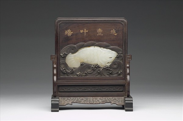 木質插屏。座雕飾幾何紋,屏面雕波濤紋,內嵌白玉魚可兩面觀賞,與玉魚相映。屏正反有款識,一面為「兆豐叶瑞」隸書填金,另一面為御製詩文。
