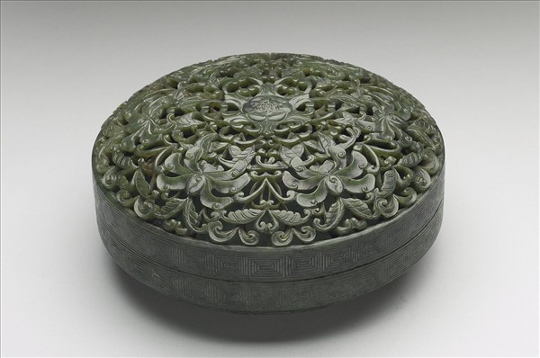 碧玉,玉色墨綠有灰斑。全器略呈扁圓形,器與蓋略相等,有圈足。蓋面鏤空透雕纏枝番蓮,蓋緣與口沿飾回紋,腹部下方圈足外則陰刻葉紋。