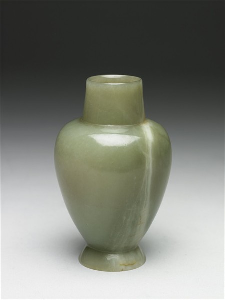 玉質,有白色斑紋。直口,長頸,豐肩,瓶腹內斂,圈足略向外撇。