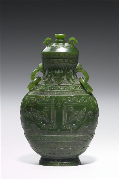 碧玉,有黑點及白斑。全器呈橢圓形,帶鈕蓋、束頸、二耳、扁圓腹,有圈足。二耳立雕獸首,下接活環。頸飾垂葉紋,腹部以二相對夔龍組合成獸面紋,腹下方近圈足處有葉紋,以回紋為地。器底圈足內有單行橫書「乾隆年製」篆款。
