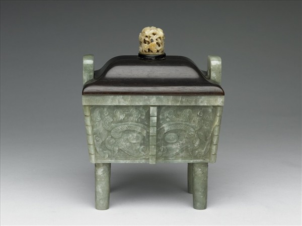 玉質,玉色泛灰,滿布白綹斑。器身為方形,立耳,柱足,有棱脊。口沿飾回紋,腹部淺浮雕獸面紋,柱足上方也飾獸面紋。腹底陰刻填金六字三行隸款:「大清乾隆仿古」。附玉頂木蓋,玉頂透雕荷塘白鷺。