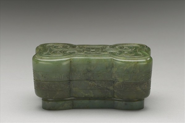 碧玉,間有黑斑點及赭斑紋。全器略成長方形,但兩端呈如意形狀。器分三部份可拆卸:蓋、盒身與座足。蓋面淺浮雕花朵及纏繞繩紋,蓋沿與盒身則各飾回紋一周。盒底部有圓形凹入,用以與座足嵌合。