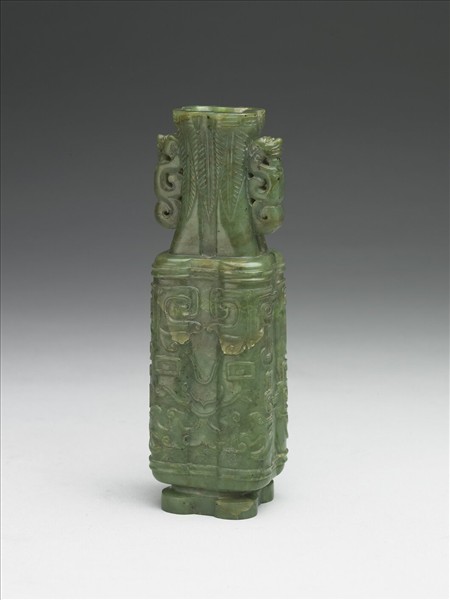 碧玉,玉色綠偏黃,有赭斑。全器為四個圓瓶組合而成,長頸、兩耳、長頸、方形腹、有圈足。耳作獸形立雕。頸部飾三角垂葉紋,腹部則為獸面紋。
