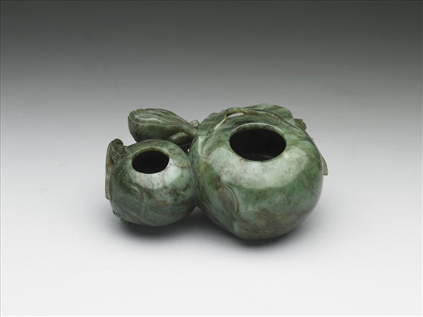 碧玉,有赭色斑及黑斑點。全器作大小兩桃實,並有高浮雕桃幹枝葉圍繞相連,兩器皿皆為斂口圓鼓腹,中間有一穿孔,以使兩水盛之水相通。