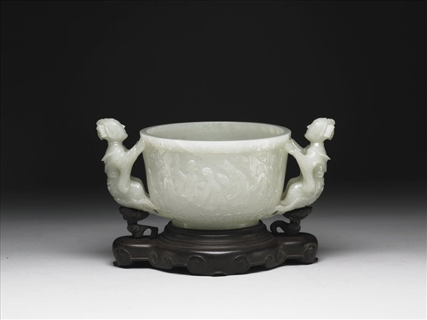 玉質佳。圓口、深壁、圈足、兩側各一仕女,衣袖飄飄坐於雲朵之上,雙手扶托器緣。器外壁淺浮雕人物通景。一面琢六人:以一長者為中,前一人作引路狀、再前者手托盆景、最前一人捧花瓶;後二人舉長柄扇尾隨。另面亦一老人居中,身旁有一鹿,前方一人持果、一人持荷葉;後二人掌扇。本器係仿自現藏於美國克利夫蘭藝術館(The Cleveland Museum of Art)一件13至14世紀之玉器。器底陰刻三行六字隸書「大清乾隆仿古」。