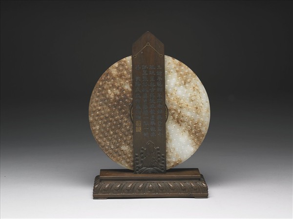 璧形圓整,厚度一致,雙面琢飾「穀紋」,配精工細製的圭形紫檀木座,座底刻「乾隆御玩」四字填金。