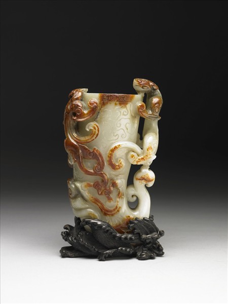 玉質,帶有大塊褐紅色塊斑,琢成獸角形杯。杯身甚長,上寬下窄,橢圓杯口。若反轉觀之,即可看清楚,原來的杯底是雕作一隻頭大身小的異獸,張著大口,口中吐出角形杯體。杯壁以陰線雕雲紋,口沿處琢回紋一圈,三隻高浮雕或立雕的螭虎、一隻浮雕的鳳鳥攀繞外壁,螭虎的頭部作梯形,陰線紋多寬深,這些現象較接近於晚明風格。