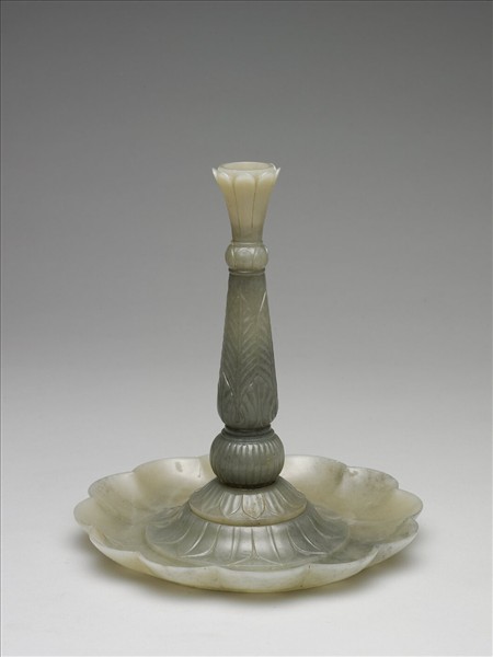 玉質,琢一頗為氣派的燭台。下方大托盤琢作簡單厚實的花瓣。長柱分六截,多琢葉紋,第一、二、五、六截的葉紋已圖案化,顯得僵硬。第四截雕垂直弦紋。第三截最長,雕一排長葉、一排短葉。葉子的外輪廓較為平順。過去的出版品中稱此件為「燈檠」,在某些波斯繪畫中見到類似的細高燭臺,故改稱之為燭臺。