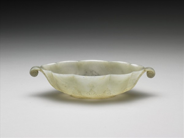 玉質,局部包裹了灰黑色礦物小粒。琢作盛開的八瓣花形橢圓碗,碗底雕琢一平展的罌粟花, 交叉覆疊四片花瓣,中央又琢一平展的菊花,花瓣十分密集。腹壁下緣圍繞一圈莨苕葉。自兩側下方沿著腹壁向上伸長一莨苕葉至口沿處,葉尖捲曲成器柄。