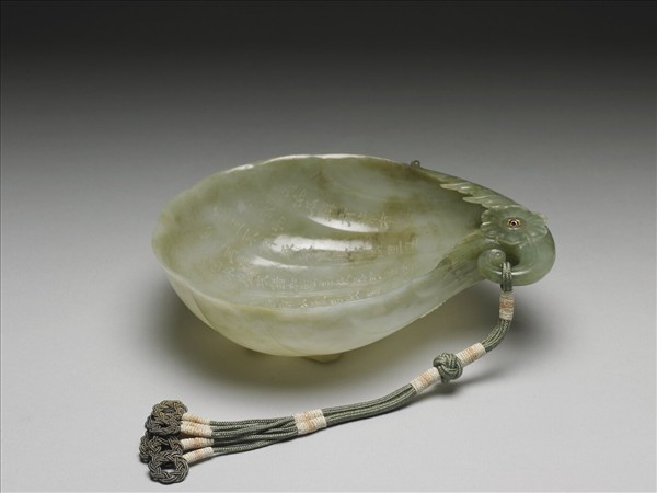 玉質,器形如半剖的瓠瓜,以疏密勻稱的波稜隔出瓜瓣。彎曲的瓜柄上浮雕一朵六瓣花,花心嵌金絲與紅寶石,再以莨苕葉紋裝飾柄端的器緣;從柄端向器底伸出莖、葉,浮雕一朵盛開的蓮花。花心嵌金絲與紅寶石。花葉紋生動自然,應是17世紀中葉蒙兀兒帝國的作品。進入清宮後,為之加配絲穗。 杯內有乾隆三十八年(1773)的御製詩〈御製痕都斯坦玉瓜瓣瓢〉:「玉瓢一握如瓜瓣,有蒂有葉還有花。和闐出玉不解琢,琢自痕都萬里遐。崑崙之岡產美質,喀嗎水磨攻錯加。製為飲器可攜帶,清泉舉酌勝烹茶。異域都大尚武備,以獵以戰隨操拏。是蓋彼中貴者用,非棗乃似安期瓜。弗徵弗索聽貿易,近利市至三倍奢。徒置棐几佐文玩,殊方聲教奚事誇。卻笑設贈許顏輩,棄而弗頠當興嗟。」後有「乾隆癸巳孟春中濣御題」與「乾」、「隆」二印。詩錄於《御製詩四集》卷9頁22。 清宮舊藏,原儲於紫禁城乾清宮。