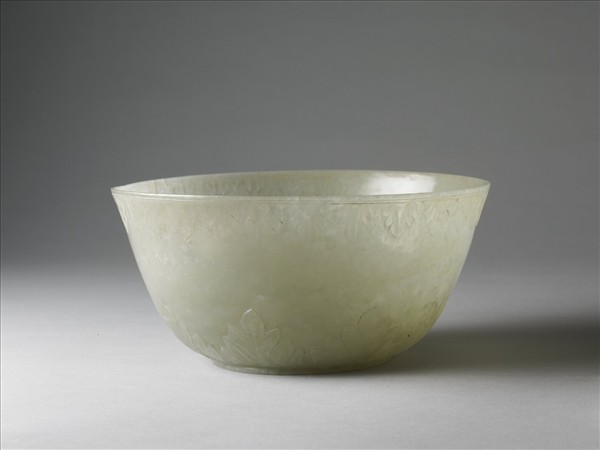玉質,局部有兩條已沁為淺褐色的裂痕。圓碗侈口深腹淺圈足,口沿及腹壁下方,各琢一圈莨苕葉紋。