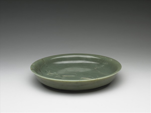 碧玉,有璺。侈口、淺壁、平底、矮圈足。外底心陰刻「乾隆年製」四字篆款。