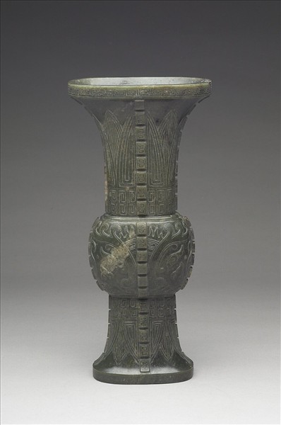 玉質,雕仿銅觚器形。侈口,長頸,鼓腹,圈足,有棱脊。頸、足飾蕉葉紋,腹飾獸面紋,口沿、棱脊飾回紋。