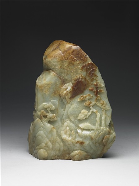 玉質多白斑,留褐色玉皮。順玉原材成山形。泉水蜿蜒而下,二士人臨泉佇立,身軀略側,似聆泠泠水聲,姿態生動。山壁上陰刻填金楷書清高宗題畫詩一首:「御題紫雲峰詩 際天峰疊樹槎枒,日照晶晶蔚紫霞。底事千秋色不變,多因津逮潤丹砂。」詩錄於《清高宗御製詩文全集‧御製詩三集》卷14頁13,〈題董邦達葛洪山景─紫雲峰〉辛巳(乾隆26年)。