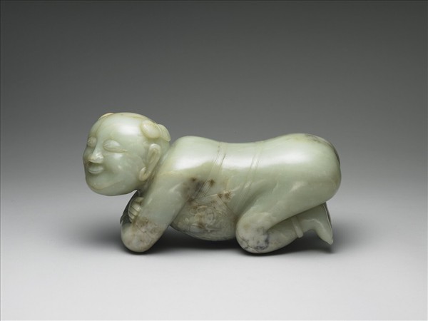 全器作嬰兒趴伏姿態,頭部左撇,雙手交疊,雙足跪曲。腹著花葉紋肚兜,腕、足戴環。