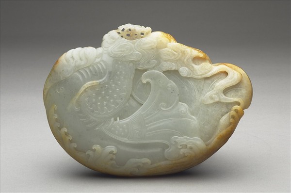 玉質,上緣雕雲紋,底琢波濤紋,鰲魚蜷曲跳躍,龍首瞠目仰視,魚身迴旋扭轉。取魚躍龍門之意象。