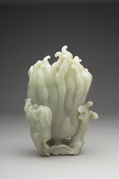 玉質,整器雕作成一佛手瓜,瓜表縱痕甚深,至瓜頂處分裂為如指爪的瓜體,嫩梢卷曲而飽滿,萌發生意。除了做為主體的佛手瓜外,在佛手瓜下半部還雕附了小佛手瓜、桃樹、靈芝,添加了器物的吉祥寓意。