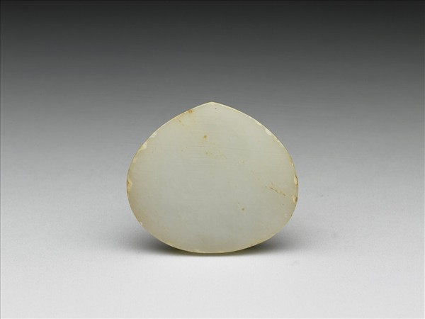 玉質,有赭斑與細璺。器作桃心形,兩面皆光素無紋,背面有象鼻穿三。