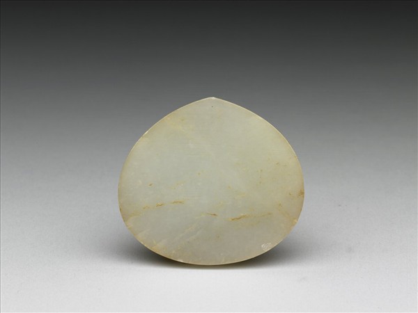 玉質,有赭斑與細璺。器作桃心形,兩面皆光素無紋,背面有象鼻穿三。