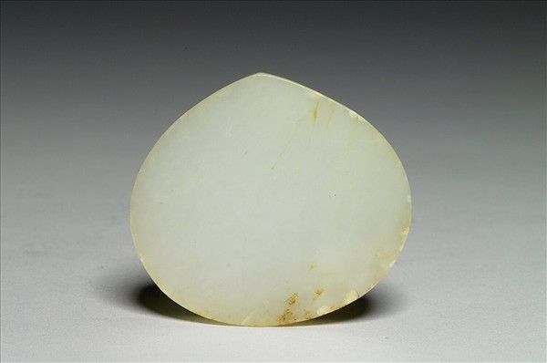 玉質,有赭斑與細璺。器作桃心形,兩面皆光素無紋,背面有象鼻穿三。