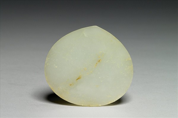 玉質,有赭斑與細璺。器作桃心形,兩面皆光素無紋,背面有象鼻穿三。