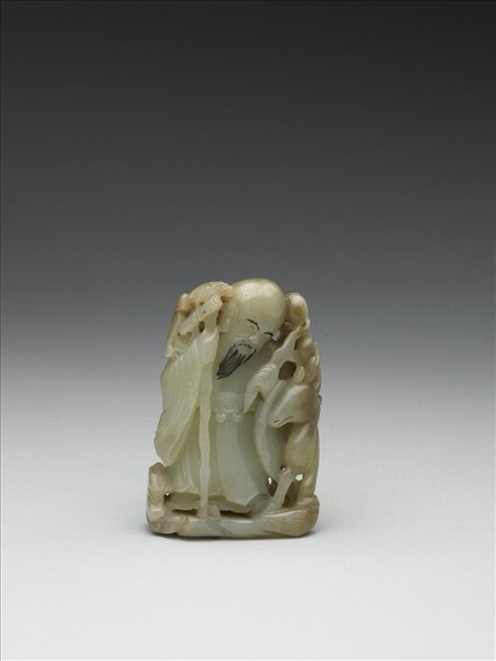 玉質,有片狀赭斑與璺。全器立雕為一立姿壽星,壽星眉鬚有墨染,右手持杖,杖頂著一蝙蝠,左手持一桃枝,側邊有鹿。壽星背上並背有團壽字。壽星、鹿及蝙蝠有「福祿壽」之喻。