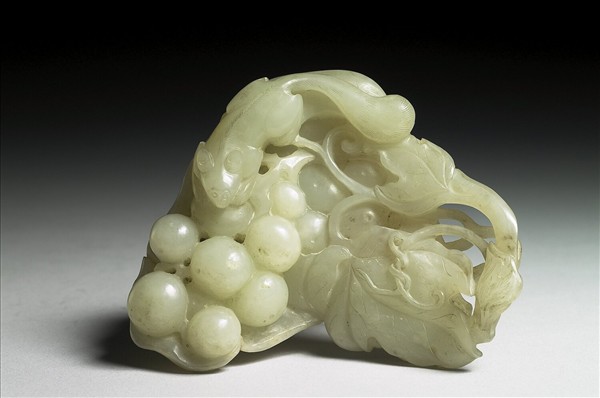 玉質,有細璺。全器作松鼠爬伏於葡萄藤葉之間,背面刻劃葉紋與藤鬚。