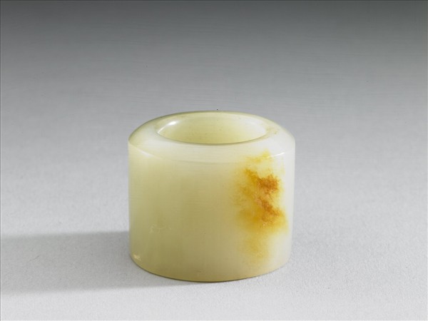 玉質,局部有片狀赭斑。器作圓筒狀,全器光素無紋。