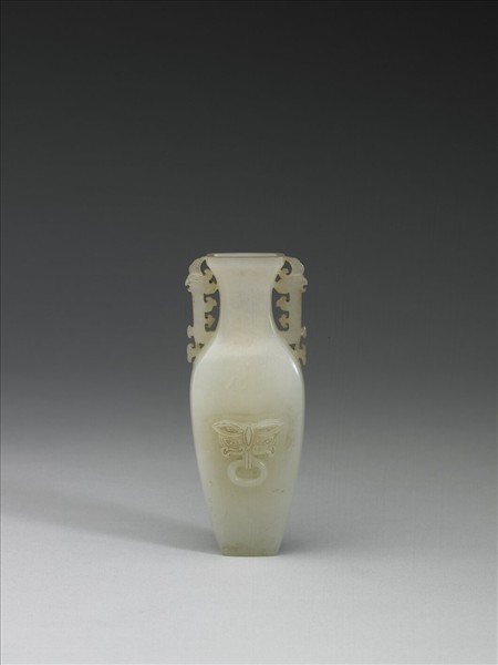 玉質。全器作扁方形。雙耳作立雕夔鳳紋,腹部之一面浮雕獸面銜環。