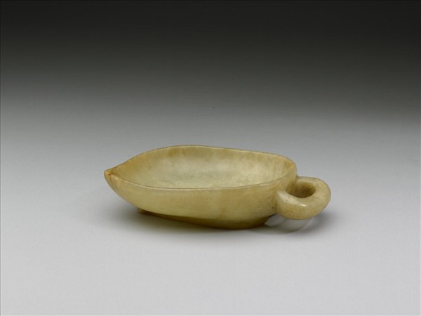 玉質,玉色泛黃,有璺。器身呈桃實形,淺腹、圈足,尾端帶環耳把。