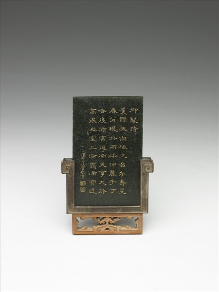 碧玉,色呈深綠色。器呈長方板狀形,無紋,一面有陰刻填金隸書款那彥寶書「御製詩:矍鑠來南極,三台分壽星,春分現於丙,秋仲麗乎丁,合度循常道,同天享大齡,高張北堂上,瑞靄滿宮庭,臣那彥寶敬書。」下接「臣那彥寶」、「恭書」兩鈐印。那彥寶於乾隆至嘉慶時期為官。附木座。