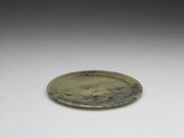 玉質,帶片狀灰斑。唇口、淺壁、平底。底心微凹,盤心微凸。全器無紋飾。