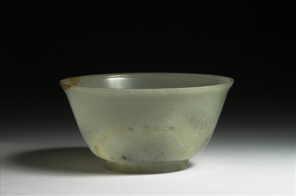 玉質,玉色泛灰,口沿帶赭斑,碗壁及底部則有黑斑。侈口、弧形壁、有圈足。器內壁口沿處有凹弦紋一道。