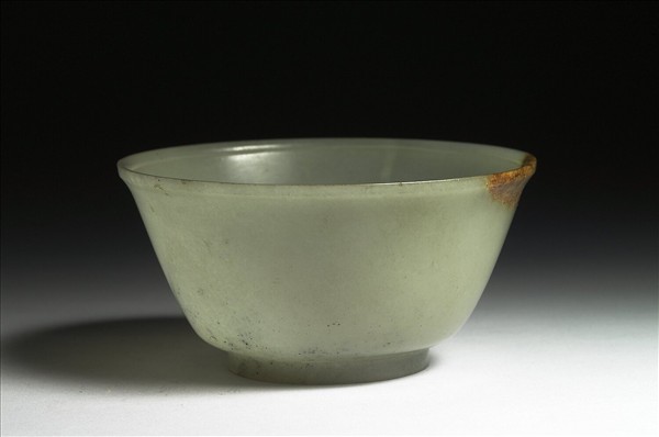 玉質,玉色泛灰,口沿帶赭沁,碗壁及底部則有黑斑。侈口、弧形壁、有圈足。器內壁口沿處有凹弦紋一道。