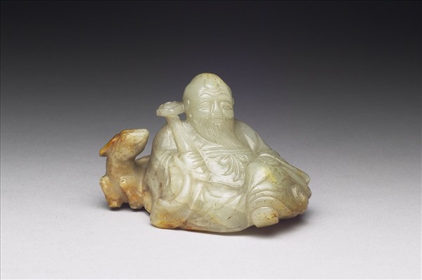 玉質,局部帶黃赭色、褐色斑紋。雕成一老者,長鬚高額,衣裝隆重,右手持如意,其右側有一隻跪坐的鹿,轉首望老者,一片祥和安樂。額高、鬚長、面容慈祥的老者,為民間傳說之神「壽星」的特徵,常以手捧桃之形象出現,此器則雕其手持如意。右倚鹿,鹿諧音「祿」。形狀像靈芝的如意及鹿都有吉祥之喻意。