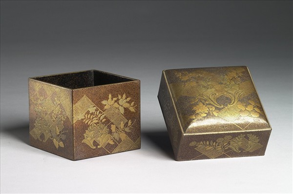 方形蒔繪盒。盒外飾梨地,上繪植物花卉紋,盒內為黑漆地灑金。