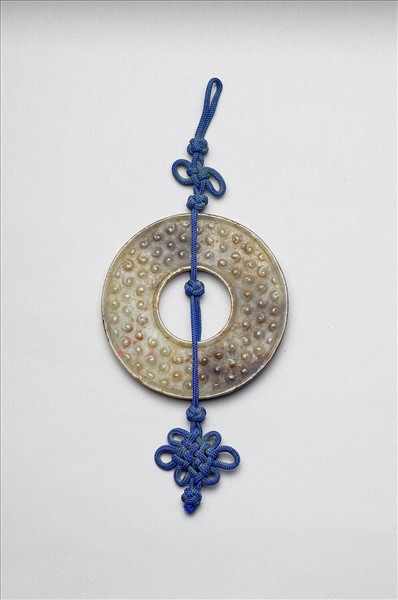 玉質,圓整,厚薄均勻;中孔為雙面對鑽,有臺稜;外緣壁平直。器面上浮雕穀紋。